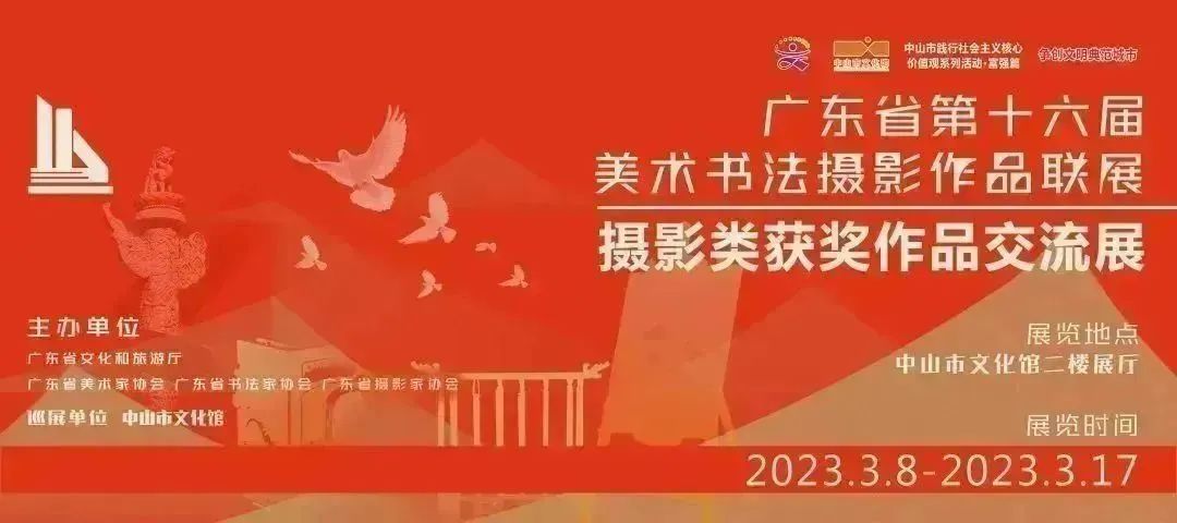 主办单位 广东省文化和旅游厅 广东省美术家协会 广东省书法家协会 广东省摄影家协会 巡展单位 中山市文化馆 展览时间 3月8日至3月17日 展览地点 中山市文化馆二楼展厅 前言 为深入学习贯彻落实党的二十大精神及习近平新时代中国特色社会主义思想,全面展示近三年来我省群众文艺工作者美术书法摄影创作成果,2022年6月至12月,广东省文化和旅游厅、广东省美术家协会、广东省书法家协会、广东省摄影家协会共同主办广东省第十六届美术书法摄影作品联展。 本次联展共收到全省各地的参评作品4331件,经专家评审,最终评出金奖作品15件、银奖作品30件、铜奖作品45件、优秀奖作品145件。我市选送美术书法摄影作品共获得银奖4个、铜奖10个、优秀奖16个,广州、深圳、珠海、佛山、梅州、东莞、中山、江门市文化馆8个单位获“优秀组织奖”。 在广东省文化馆的大力支持下,特举办本次联展摄影类获奖作品交流展,以促进我市摄影爱好者交流相融、互学互鉴,推动我市摄影艺术创作的提高与发展。获奖作品以当代艺术视角描绘新时代,歌颂新生活,展现社会生活的发展变迁,刻画人民群众昂扬向上的精神风采,彰显了广东群众文艺工作者深入生活、礼赞时代、勇于创新、积极奋发的创作面貌。 春华秋实廿三载,砥砺前行谱新章。广东省美术书法摄影作品联展自1999年创办以来,始终坚持以文艺为媒,讴歌美好生活,引领时代风尚。党的二十大胜利召开,站在新的历史起点上,全省群众文艺工作者将牢记使命,不忘初心,坚持以人民为中心的创作导向,不断创作更多增强人民精神力量的优秀作品。广东省美术书法摄影作品联展也将继续发挥阵地作用,不断繁荣全省群众文艺创作,推动现代公共文化服务体系建设迈上新台阶。 参展作品选登 ▲《东莞“智”造》(金奖)作者:夏钊昇 ▲《山河无恙》(金奖)作者:李标 ▲《钟书阁》组照(金奖)作者:林江 ▲《中微子实验室建设时》(金奖)作者:陈家鸣 ▲《我爱你中国》(金奖)作者:付卫忠 ▲《绘龙舟》(银奖) 作者:黄炎荣 ▲《夜读》(银奖) 作者:王建俭 ▲《众志成城》(铜奖) 作者:简建文 ▲《牛气冲天跃新高》(铜奖) 作者:文智诚 ▲《砥砺》(铜奖) 作者:梁敏仪 ▲《晒谷场上劳动美》(优秀奖) 作者:文智诚 ▲《夫妻光荣在党50年》(优秀奖) 作者:吴汉斌