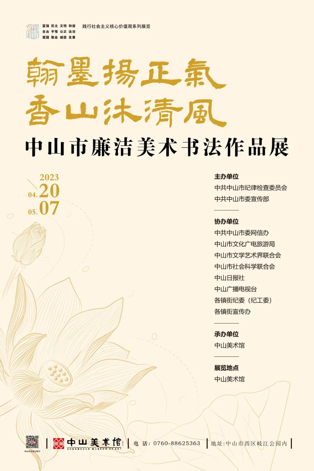 中共中央《关于加强新时代廉洁文化建设的意见》指出:全面从严治党,既要靠治标,猛药去疴,重典治乱;也要靠治本,正心修身,涵养文化,守住为政之本。要坚持以习近平新时代中国特色社会主义思想为指导,深入贯彻落实党的二十大精神,推动新时代廉洁文化建设实起来、强起来,不断实现干部清正、政府清廉、政治清明、社会清朗。 为深入开展学习贯彻习近平新时代中国特色社会主义思想主题教育,在新征程上坚定不移推进全面从严治党,扎实推进我市廉洁文化建设,中共中山市纪律检查委员会、中共中山市委宣传部联合举办本次廉洁书画作品展。活动共展出作品142件,其中美术类59件,书法类83件,作者大多是我市各行各业的普通干部群众。入选作品围绕加强党风廉政建设主题,从中华优秀传统文化中汲取养分,取法多元,形式多样,雅俗共赏,寓意深刻,富有新时代的文化内涵和教育意义。 翰墨扬正气,香山沐清风。希望本次展览有助于广大干部群众进一步学习领悟习近平新时代中国特色社会主义思想,激发崇德尚廉的精神力量,感受文化艺术的强大魅力,激励党员干部更加勇于自我革命,始终保持干事创业的精神状态,营造风清气正的政治生态,凝心聚力转作风、再出发、开新局,以实际行动推进文化兴城建设,创建全国文明城市,奋力开创中山高质量发展新局面,确保党的二十大精神在中山落地生根,结出丰硕成果! 主办单位 中共中山市纪律检查委员会 中共中山市委宣传部 协办单位 中共中山市委网信办 中山市文化广电旅游局 中山市文学艺术界联合会 中山市社会科学界联合会 中山日报社 中山广播电视台 各镇街纪委(纪工委) 各镇街宣传办 承办单位 中山美术馆 展览时间 2023年4月20日至5月7日 开幕式时间 2023年4月23日 上午10:00 展出地点 中山美术馆(中山市西区岐江公园内) 部分作品展示 美术作品 ▲特邀作品 梁欣基《清气》国画 136x68cm ▲特邀作品 肖伟《钟馗驱瘟镇邪图》国画 180x96cm ▲特邀作品 杨宁《清廉一生》国画 138x69cm ▲特邀作品 梁静雯《世世清白事事如意》国画 136x68cm ▲特邀作品 邱敏君《“疫”线志愿红》水彩120x120cm ▲特邀作品 谭德开《清风》油画 120x120cm ▲获奖作品 岑曦桐《天平》国画 140x69cm ▲获奖作品 陈绍君《纤尘不染》油画 130x180cm ▲获奖作品 冯霞仪《事事清白》国画 69x69cm ▲获奖作品 何德建《崇廉尚法》皮革浮雕 82x60cm ▲获奖作品 刘运强《廉洁家风》国画 136x35cm x4 ▲获奖作品 区淑瑜《家风尚廉》国画 140x70cm ▲获奖作品 韦铭儿《莲》插画 90x120cm 书法作品 ▲特邀作品 黄衍增《廉润中山》隶书 138x70cm ▲特邀作品 余乃刚《行稳致远》楷书 136x36cm ▲特邀作品 骆培华《正道直行》行书 100x25cm ▲特邀作品 骆培华《海纳壁立联》行书 180x32cm x2 ▲特邀作品 梁斌《郑板桥诗竹石》草书 140x35cm ▲获奖作品 陈营《敢向长将联》篆书 180x28cm x2 ▲获奖作品 黄真武《廉政诗数首》楷书 177x96cm ▲获奖作品 黎石明《苏轼诗两篇》楷书 180x73cm ▲获奖作品 罗愉城《廉史汤斌传選录》行书 180x46cm ▲获奖作品 骆亦筑《廉政词两首》篆书 177x66cm ▲获奖作品 莫梫《勿骛还从联》行书 178x32cm x2