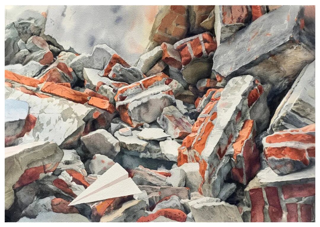 作品以生活化的废砖与纸飞机为创作素材,视角独特且立意深刻。创作者精准捕捉红砖的肌理与纸飞机的轻盈,通过红与白的强烈色彩对比、虚实相生的光影处理,将具象物象与抽象的点线面节奏融合。作品既以废墟与希望的意象碰撞引发情感共鸣,又在水彩语言的运用上展现出扎实的造型功底与个性化的审美表达,是兼具思想性与艺术性的佳作。