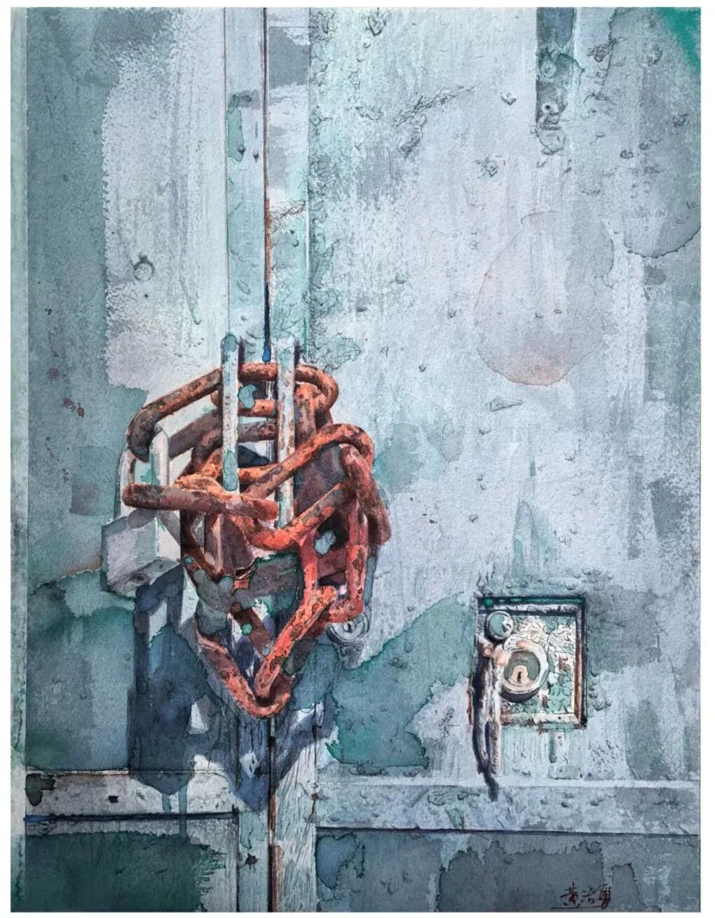 作品以旧门板与锈迹锁链为创作载体,用灰蓝底色晕染岁月的斑驳,以赭红锈迹凝固时光的痕迹。试图在褪色肌理与粗糙质感中,留存被日常忽略的岁月温度,借无声的视觉语言,让观者触摸到时光沉淀的厚重与温柔。