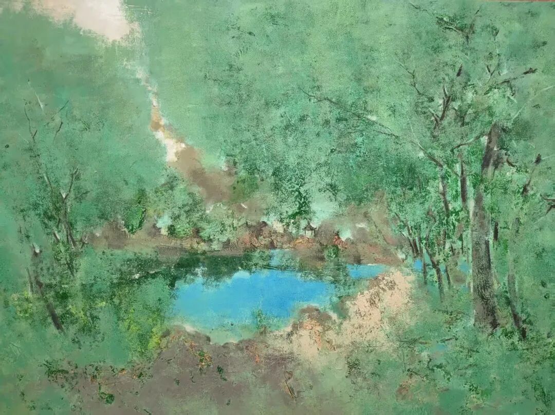 作品以青绿为主调,糅合写意与抽象手法,弱化具象轮廓,用厚重的肌理与晕染的色块表现山林的氤氲绿意。画面中一抹亮蓝的水潭成为视觉核心,与层层叠叠的青绿山林形成冷暖对比,意在捕捉山林间清幽、静谧的氛围,还原自然本真的空灵意境。